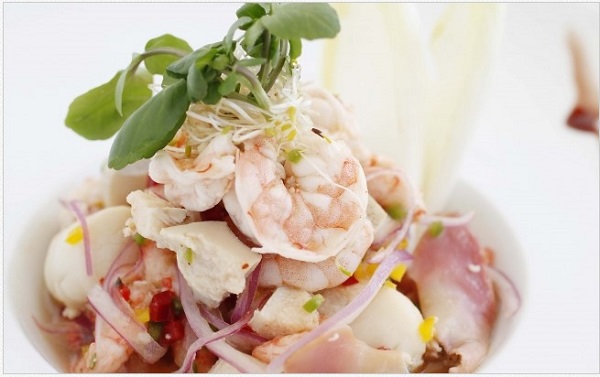 1. En un bol, poner todos los ingredientes (Cebolla Morada, Ostiones, Camarones, Machas, Pulpo, y el Mix de Pimentones).