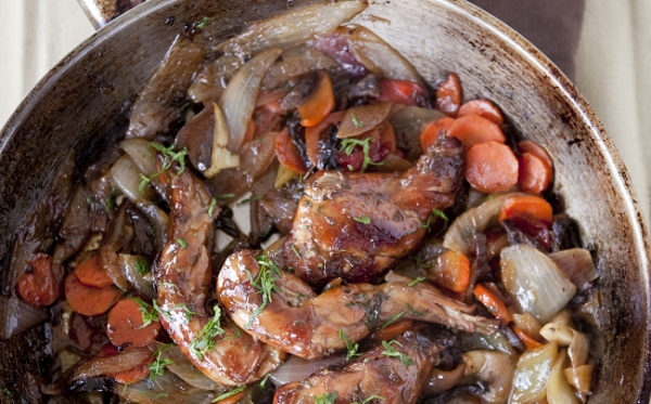 • Marinar el Conejo con el aliño preparado y adicionar un poco del Vino Blanco. Dejar reposar.