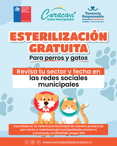 La Municipalidad de Curacaví reiteró el llamado a vecinos y vecinas a mantenerse atentos a las redes sociales oficiales del municipio, donde semana a semana se estarán informando de manera oportuna los nuevos llamados para acceder a la campaña gratuita de esterilización de perros y gatos.