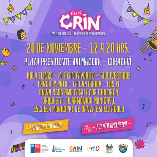 El Festival Nacional de Música para la Infancia, FestiCRIN 2022, tendrá una nueva versión este domingo en la Plaza Presidente Balmaceda en Curacaví con conciertos musicales, talleres y actividades para toda la familia.