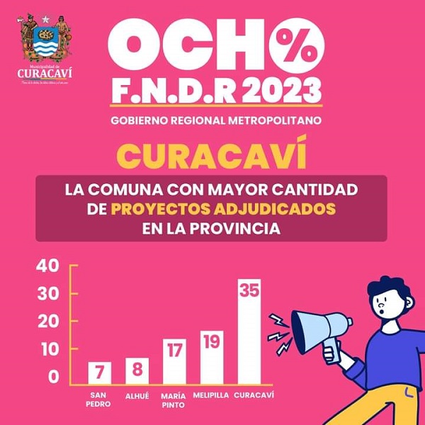 El 18 de julio se publicaron los resultados de los proyectos de Fondo Nacional de Desarrollo Regional 8% (FNDR) 2023 del Gobierno Regional Metropolitano, en los que Curacaví se adjudicó 35 de 83 posibles, por un monto total de 164 millones de pesos.