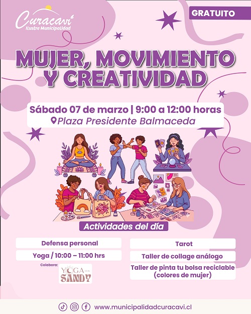 En el marco de la conmemoración del Día Internacional de la Mujer, la Municipalidad de Curacaví ha preparado una serie de actividades abiertas y gratuitas dirigidas a las mujeres de la comuna, las que se desarrollarán durante el sábado 7 de marzo en la Plaza Presidente Balmaceda.